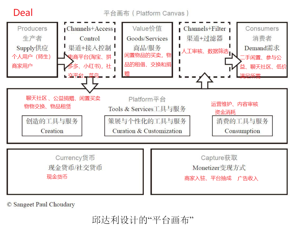 根据系统循环图可以发现,Deal提供买卖、租赁、更换、捐赠和聊天社区的价值单元,为个人用户和商家用户提供服务和工具,而维护运营平台的的Deal团队主要是与菜鸟、电商平台和校方三方面进行合作,入驻学校为校园师生提供服务,也给学校增加了价值,这样形成了一个良好的系统循环。
