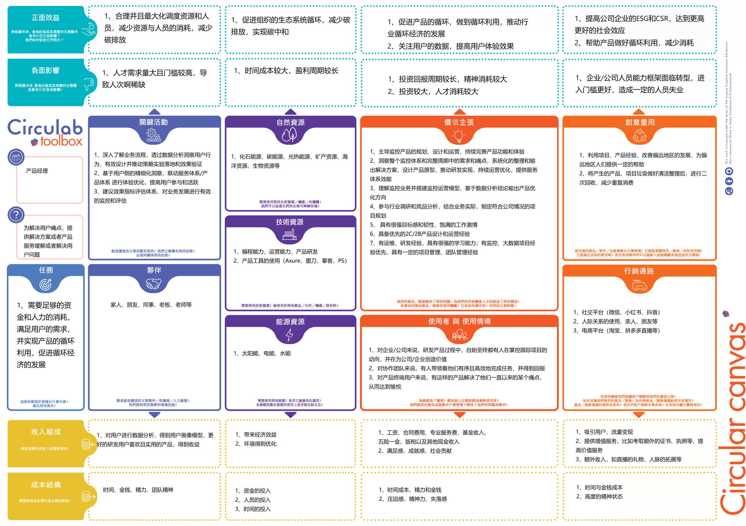 个人PS-循环经济商业模式画布中的循环经济特点2在资源、人员消耗方面,产品经理是最稀缺且门槛最高的人才需求。一个具有丰富循环经济理论和实践能力的人在市场上较少,既要能够给公司带来一定的收益,又需要对社会、环境、团队给予良好的回馈,且后期仍然要满足用户的产品需求,解决或者缓解用户的痛点。
