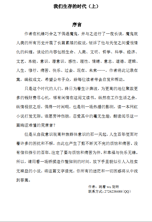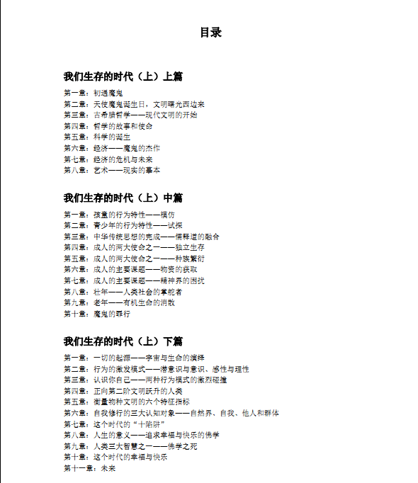 “这说来话长”我说道,“托这个时代劳动制度的福,我得以休假十日,不用劳动也能分配到购买生活资料的钱财,闲赋在家也不用担心忍饥挨饿。饱食饮足之余,再看看这牢固的钢筋混泥土楼房,智能的电器,便捷的交通,能够生活在这个时代真是让人庆幸。一时兴起便往这横跨几千年的史书里寻觅,想看看这盛世的文明,是如何在这几千年一步步建立起来的,创造了这辉煌如天使般美好的圣贤们会有怎样的光辉事迹。没想到在这厚厚的史书里难觅天使的踪迹,却页页写满了魔鬼。”