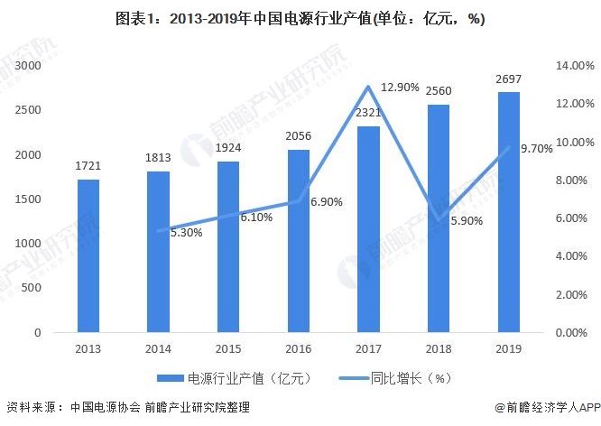 据中国电源协会发布的《中国电源行业年鉴2020》统计数据,2019年,中国电源行业产值2697亿元。