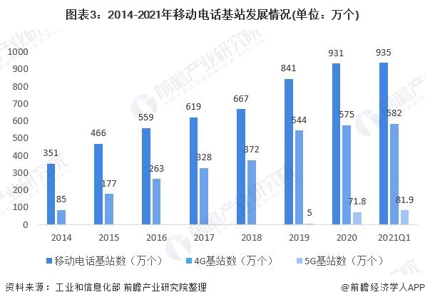 2021年一季度,我国移动电话基站总数达935万个,同比增长9.7%,其中,4G基站总数为582万个,5G基站总数81.9万个。