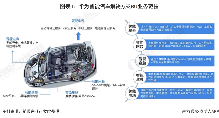 华为本身不造车,而是以“Huawei Inside”(HI)模式为车企提供软硬件,“做智能网联汽车增量部件供应商”是华为给自己在汽车领域的定位。在这个定位下,华为在2019年5月正式成立了智能汽车解决方案BU,业务覆盖范围以“云-管-端”为架构,划分为五个部分:智能驾驶、智能座舱、智能网联、智能电动、智能车云。