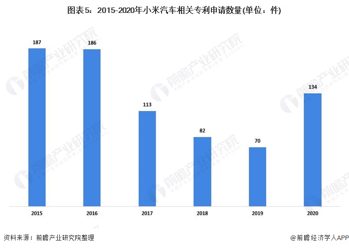 在技术方面,小米从2015年起陆续申请了汽车相关专利,2020年专利申请数量约为134件,技术布局已久。