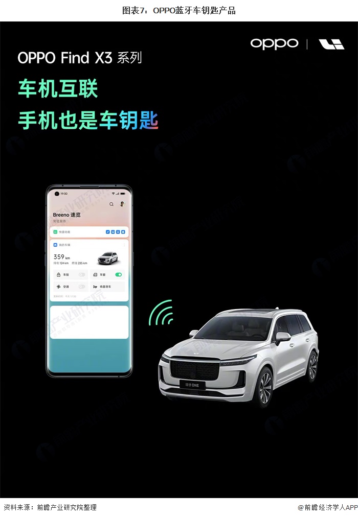 同时,OPPO在汽车领域也通过资本和产业合作做了多路布局。OPPO与国内领先的智能汽车品牌理想合作,实现了车机互联,OPPO Find X3系列手机可以作为理想ONE的蓝牙车钥匙,靠近汽车就可以自动解锁车门,此外还可以远程开窗、鸣笛寻车。