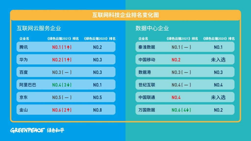 绿色和平气候与能源项目主任叶睿琪表示:“在中国迈向碳中和的进程中,互联网科技行业既有赋能各行业节能减碳的重要使命,其自身脱碳发展也至关重要。”在数字化经济转型时,各企业应该注重自身的碳排放,很多证据表明,中国互联网科技行业在可再生能源使用方面有所提升,但整体的碳中和行动滞后。下图为绿色云端2021-企业排名变化。