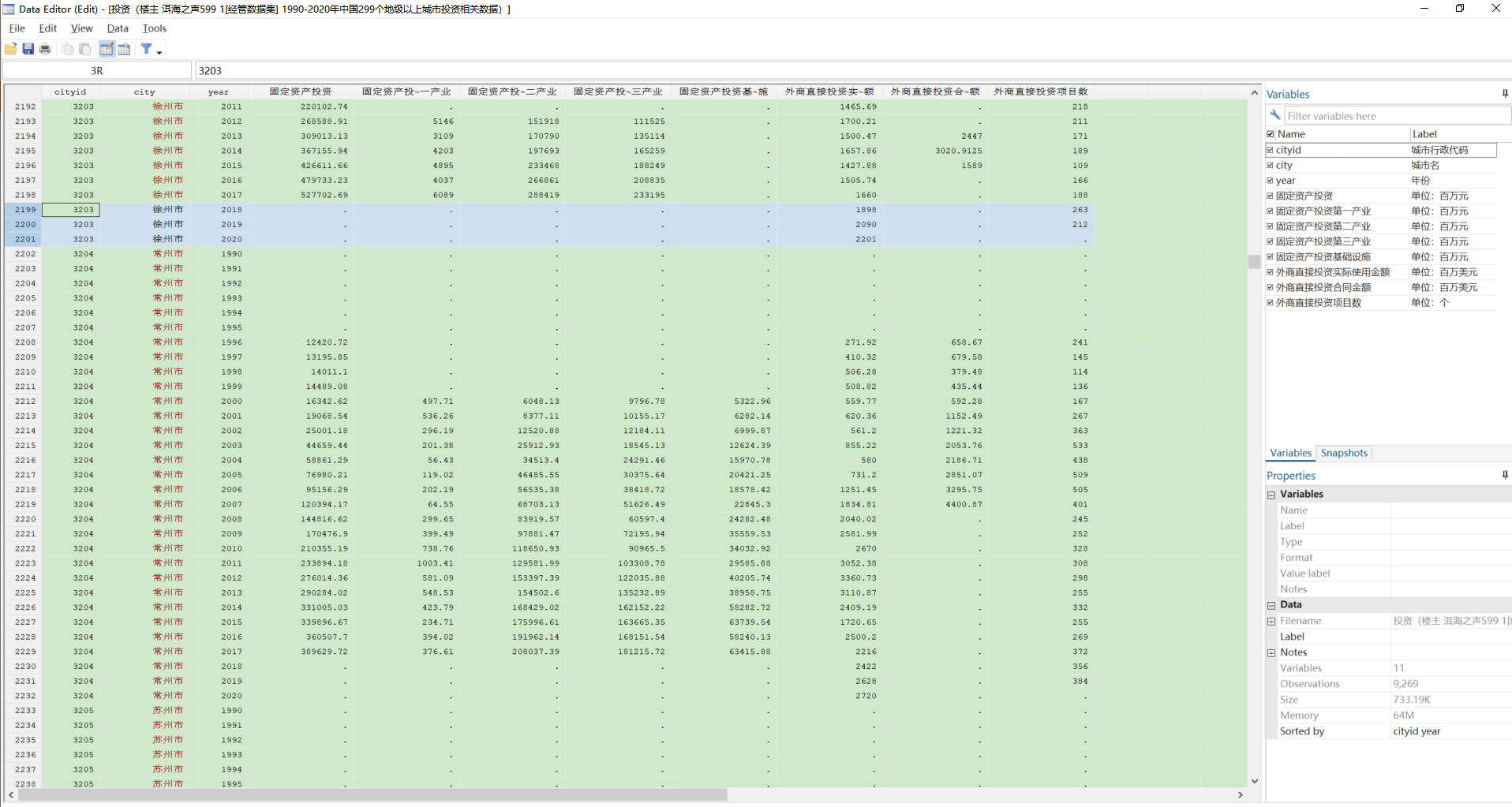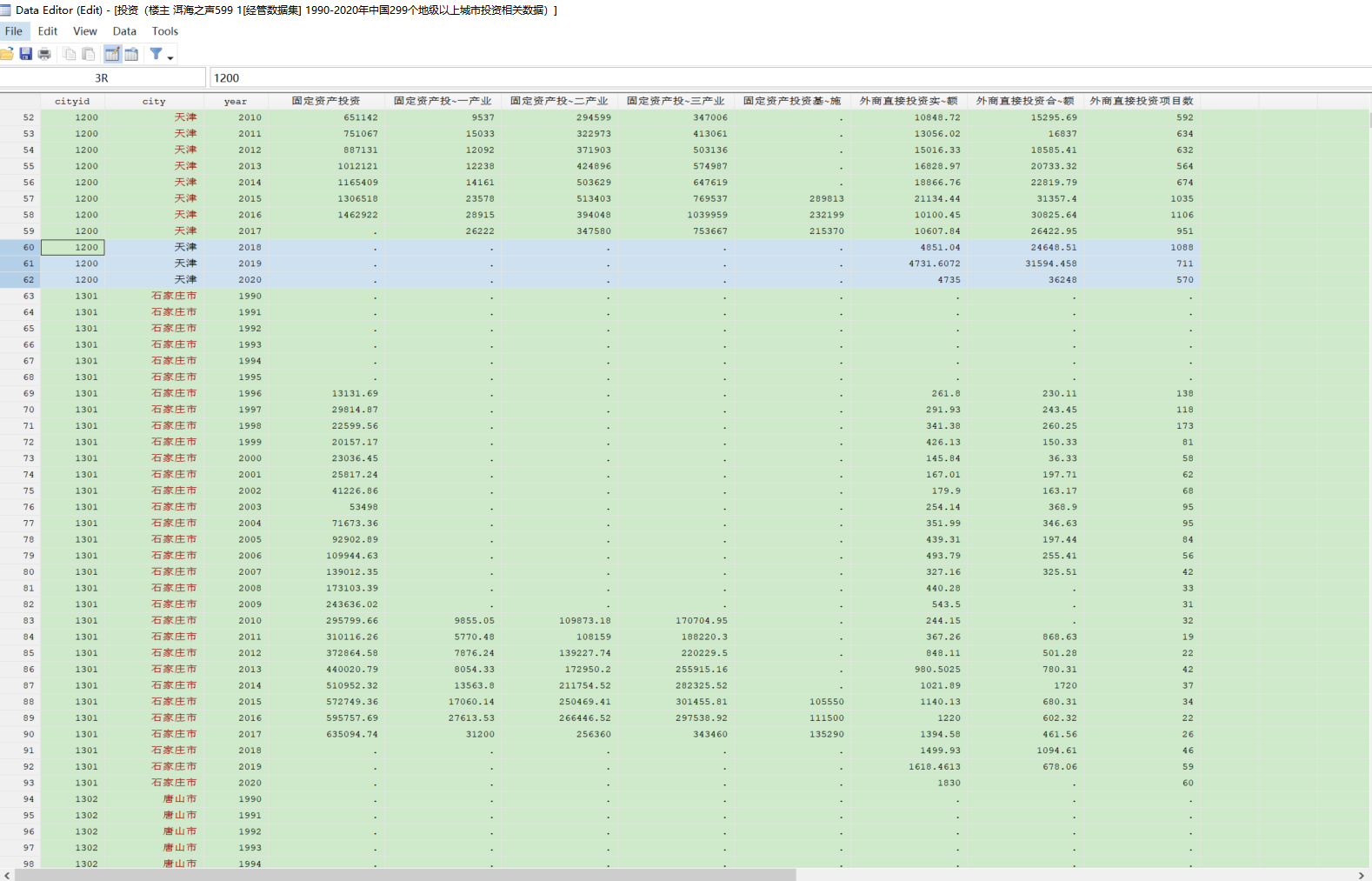 附件为我们团队手工收集并整理之后的1990-2020年中国299个地级以上城市投资相关数据(具体指标包括城市行政代码 城市名 年份 固定资产投资 固定资产投资第一产业 固定资产投资第二产业 固定资产投资第三产业 固定资产投资基础设施 外商直接投资实际使用金额 外商直接投资合同金额 外商直接投资项目数),数据来自于CEIC(中国经济数据库)。为便于大家使用,我们手工匹配了城市的行政区划代码。部分城市的部分年份缺失。保证数据与原始值相同,可直接用于研究,如有错误,承诺退款。为了方便大家使用,现提供dta格式。