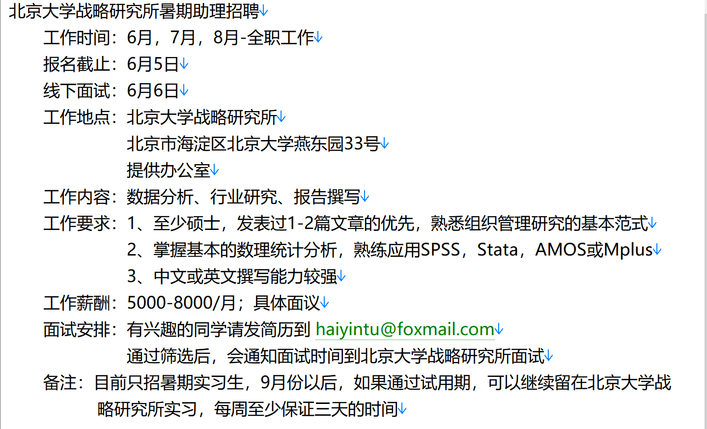 备注:目前只招暑期实习生,9月份以后,如果通过试用期,可以继续留在北京大学战 略研究所实习,每周至少保证三天的时间