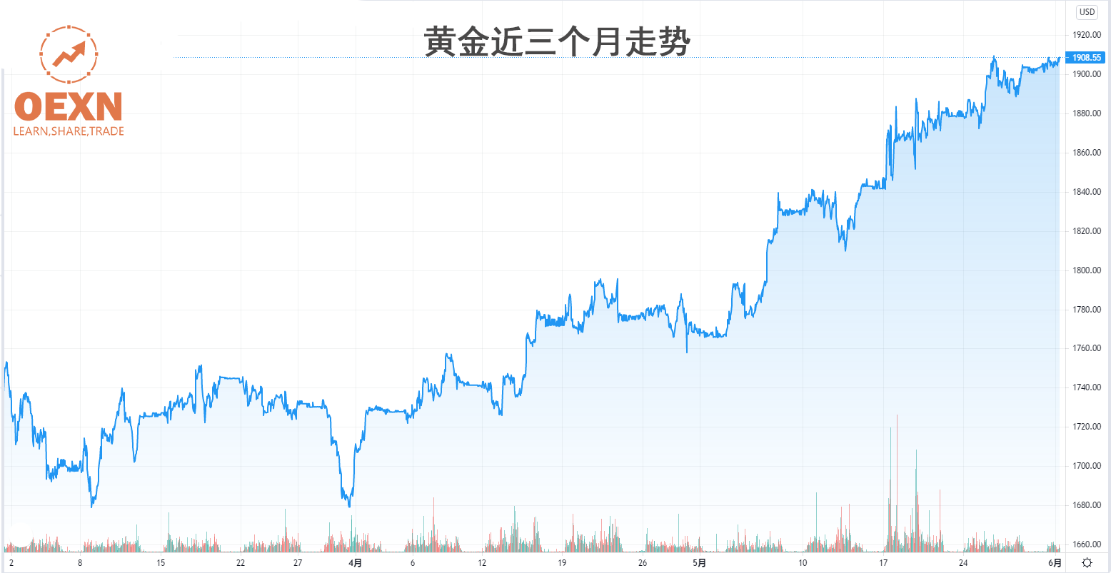 OEXN报道,亚盘早市,金价交于1908附近尽管有所回落,创下自2020年7月以来的最大月度涨幅。