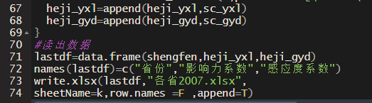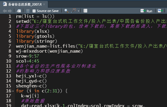 然后开始计算每个省份的投入产出表,生产性服务业对制造业的感应度和影响力系数,下面的R代码文档是计算2007年各省的生产性服务业生产性服务业对制造业的感应度和影响力系数。R代码文件是根据2007的投入产出表的格式调整好的(02、07、12、17都有微小的差异),加了一个循环,计算出每个省的之后,汇总成了一个整理好的文档“各省2007”。如下图所示