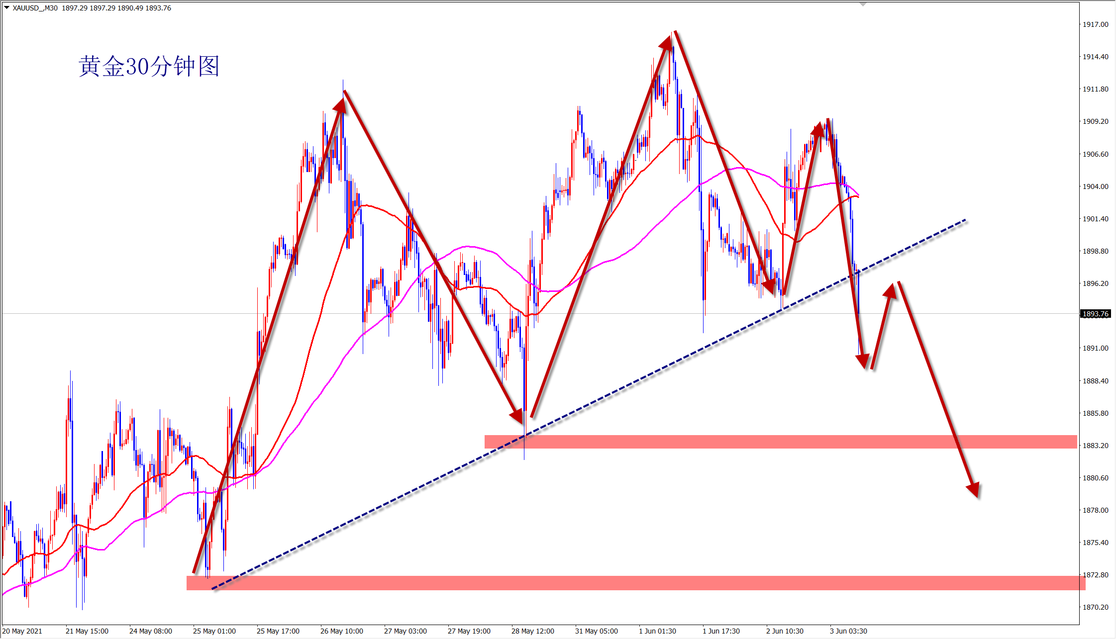 黄金1898空,止损1905,目标1890-1883;