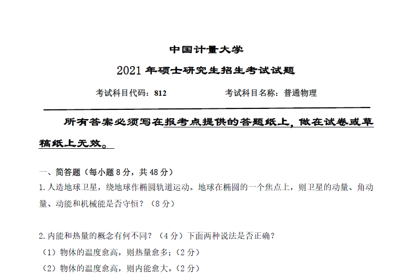 812普通物理(中国计量大学2021年硕士研究生招生考试试题).rar
