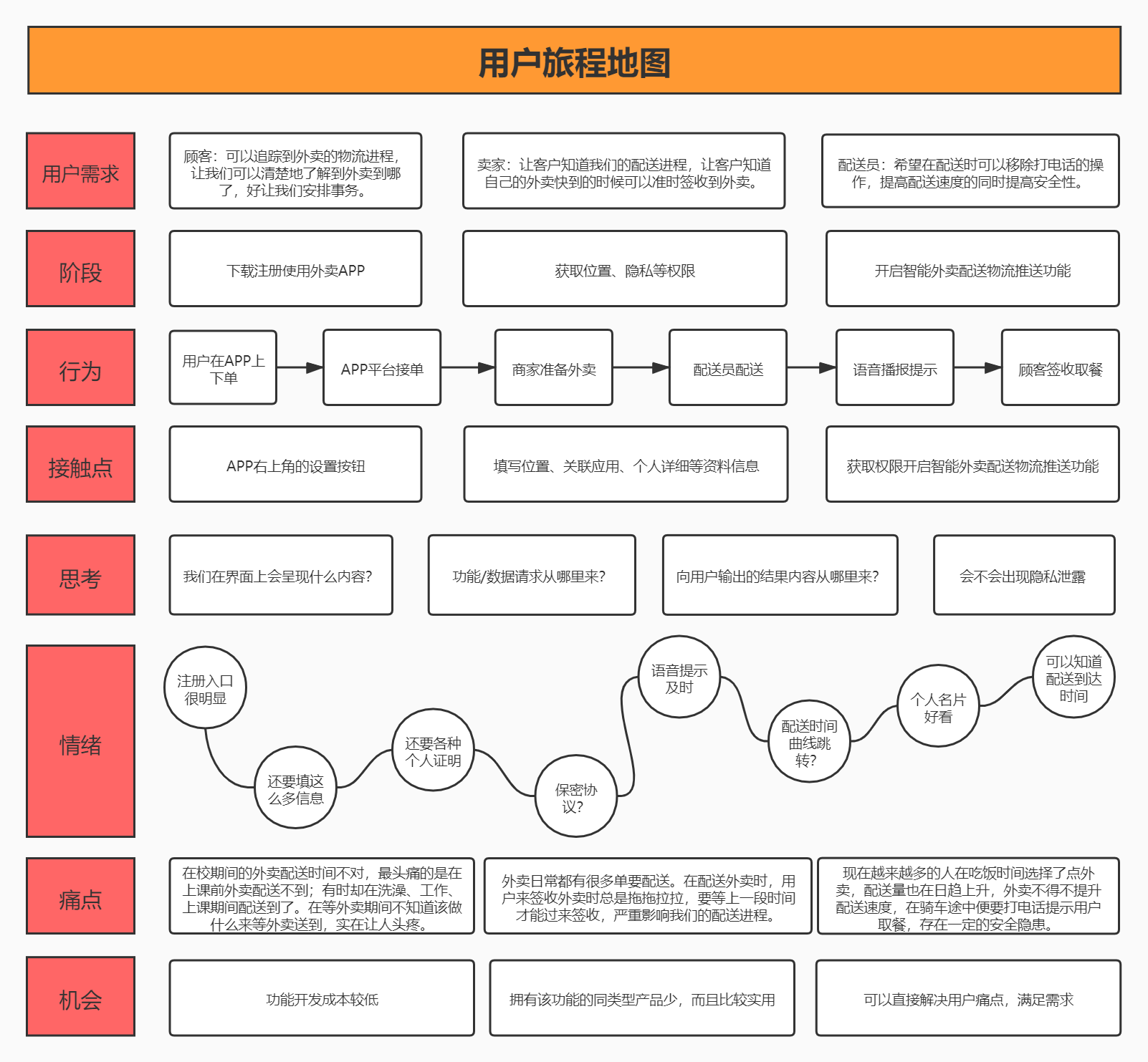 为解决外卖配送行业关于顾客取餐时间不对称的痛点,本项目团队已设计并执行《外卖配送服务数字化转型设计思维工作坊》,并产出《MRD文档》、《BRD文档》。