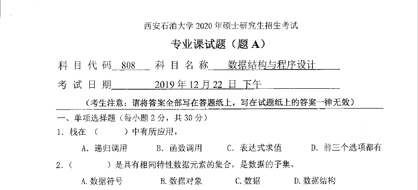808 数据结构与程序设计(西安石油大学2020年硕士研究生招生考试专业课试题).rar