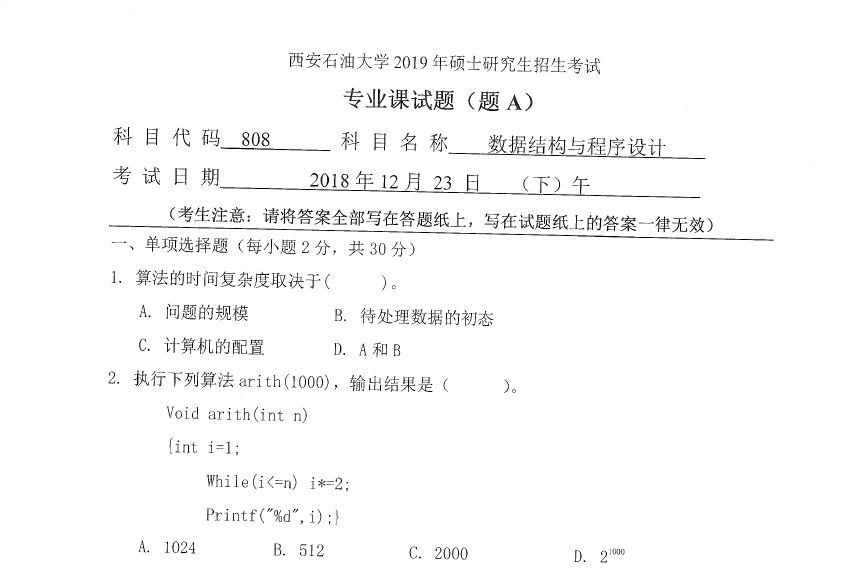 808 数据结构与程序设计(西安石油大学2019年硕士研究生招生考试专业课试题).rar