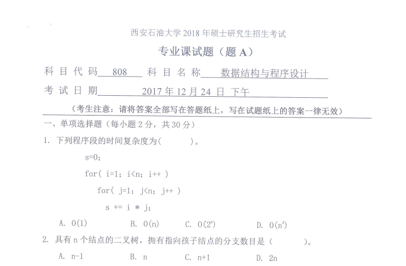 808 数据结构与程序设计(西安石油大学2018年硕士研究生招生考试专业课试题).rar