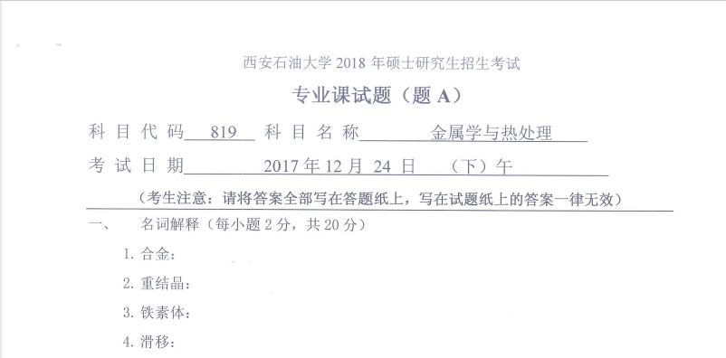 819 金属学与热处理(西安石油大学2018年硕士研究生招生考试专业课试题).rar