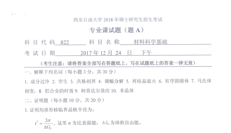 822 材料科学基础(西安石油大学2018年硕士研究生招生考试专业课试题).rar