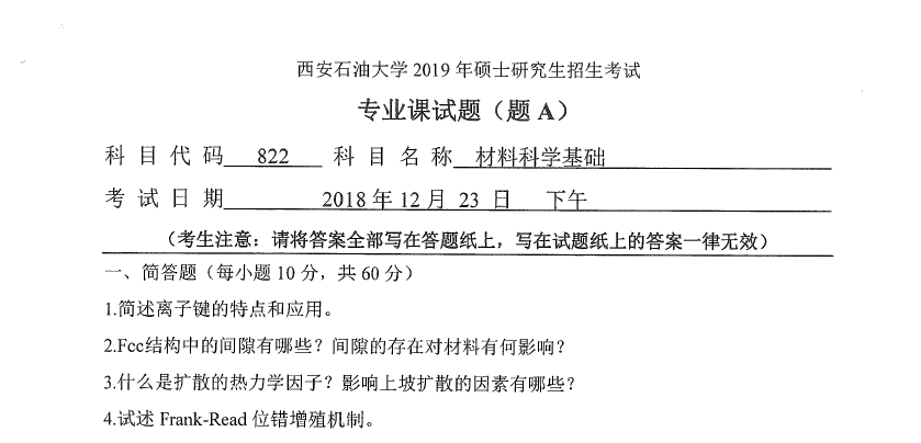 822 材料科学基础(西安石油大学2019年硕士研究生招生考试专业课试题).rar