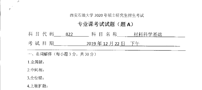822 材料科学基础(西安石油大学2020年硕士研究生招生考试专业课试题).rar