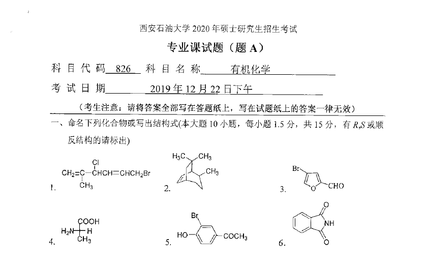 826 有机化学(西安石油大学2020年硕士研究生招生考试专业课试题).rar