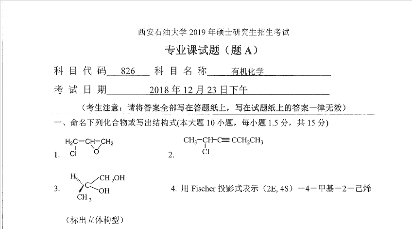 826 有机化学(西安石油大学2019年硕士研究生招生考试专业课试题).rar