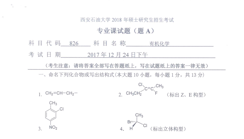 826 有机化学(西安石油大学2018年硕士研究生招生考试专业课试题).rar