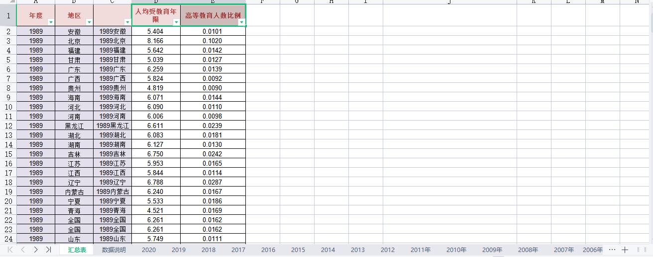 本次共享的是1989-2019年中国省级人均受教育年限与学历结构数据,数据来源于中国统计年鉴,文件给出了每年统计年鉴原始数据,并参考胡鞍钢等多位学者的平均受教育年限计算公式根据1989-2019年中国省级学历结构数据最终计算得到人均受教育年限。