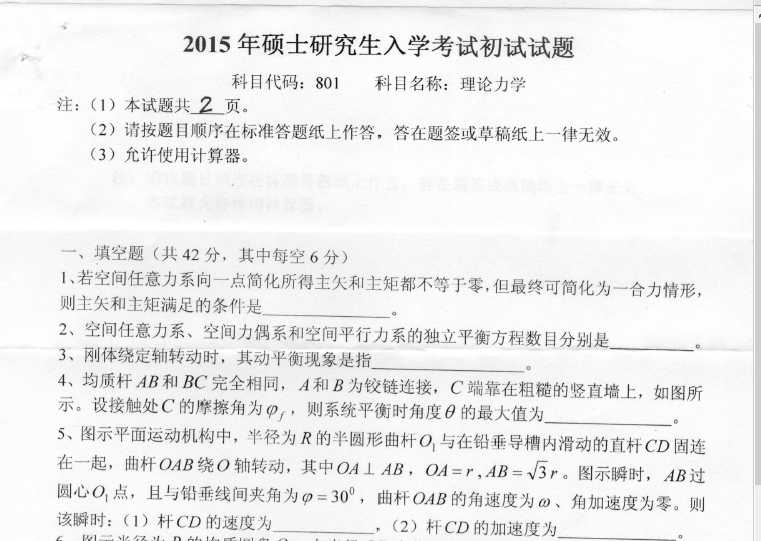801 理论力学(燕山大学2015年硕士研究生入学考试初试试题).rar