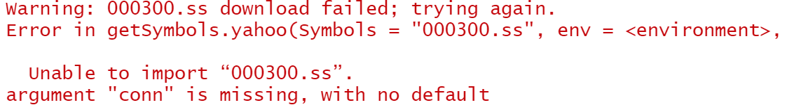 在R中获取沪深300指数数据时遇到的问题通常与数据源和库有关。你使用的`getSymbols()`函数来自quantmod包,但该函数默认从Yahoo Finance拉取数据,而Yahoo可能并不提供沪深300(SH000300)这样的中国股市指数。