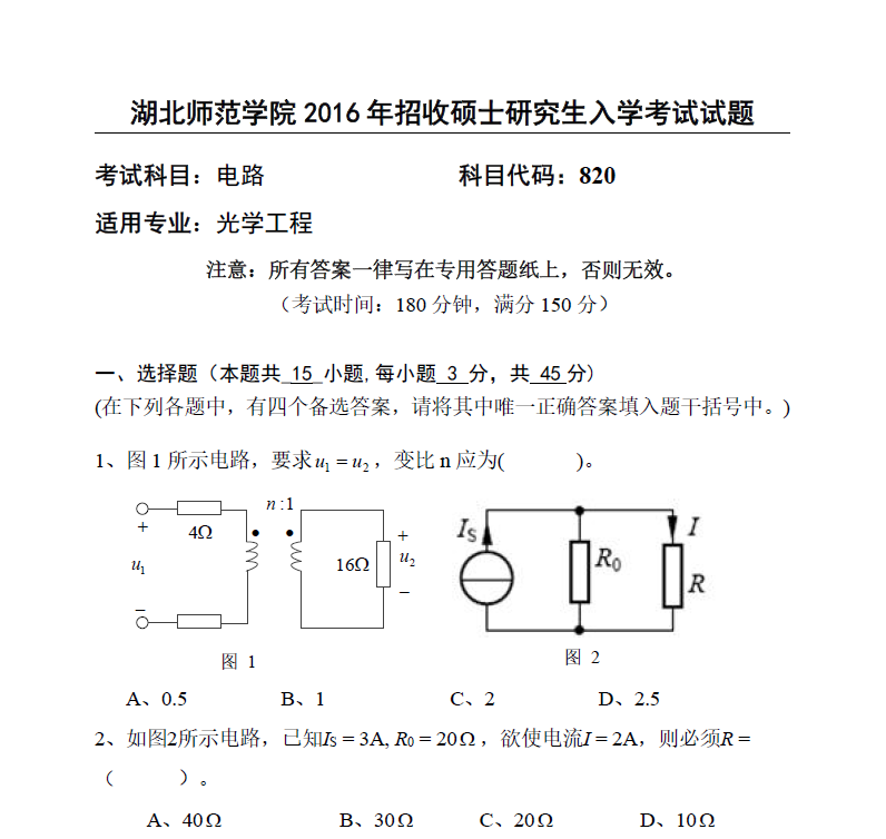 820 电路(湖北师范学院2016年招收硕士研究生入学考试试题).pdf