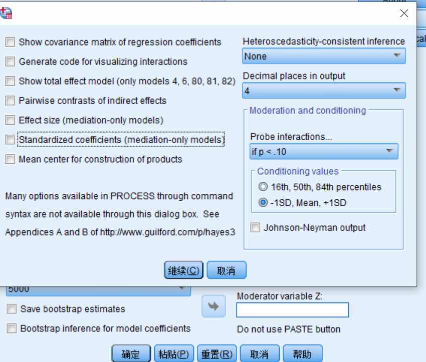 在进行“有调节的中介”分析检验数据,用process操作应勾选如下图所示的哪些选项?