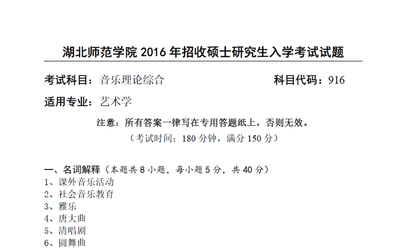 湖北师范学院 916 音乐理论综合(2016年)考研真题