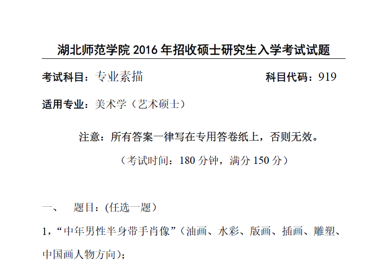 919 专业素描(湖北师范学院2016年招收硕士研究生入学考试试题).pdf