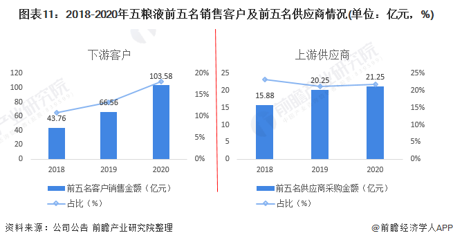 从主要供应商看,2018-2020年,五粮液前五名供应商采购金额也逐年增长,但增幅较小,2020年,五粮液前五名供应商采购金额达21.25亿元,较2019年仅上升1亿元,占比达21.78%。