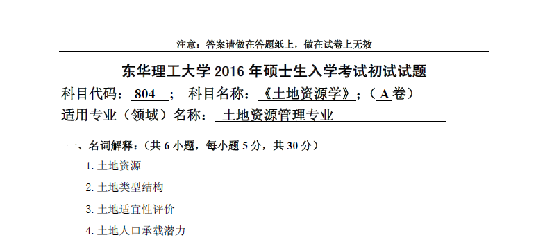 804土地资源学(东华理工大学2016年硕士入学考试初试试题).rar