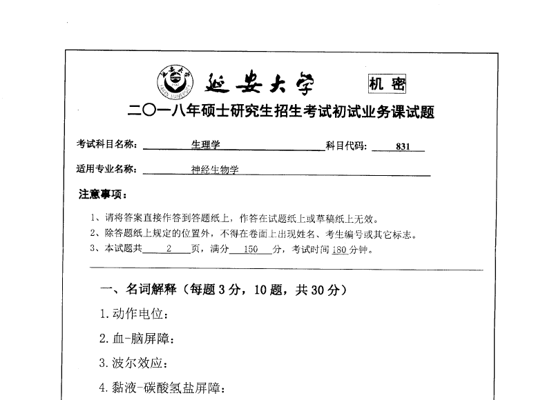 831生理学(延安大学2018年招收攻读硕士学位研究生入学考试业务课试题).rar