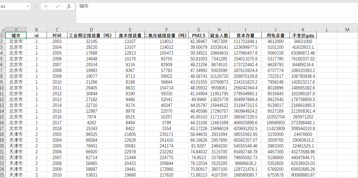 这套数据非常好,总共11个指标,包括:城市 id 时间 工业烟尘排放量(吨) 废水排放量 二氧化硫排放量(吨) PM2.5 就业人数 资本存量 用电总量 不变价gdp 全要素生产率不仅反映生产技术水平的高低,也反映生产效率的高低,这意味着不仅可以通过技术进步来提高全要素生产率,也可以通过生产要素的重新配置,将生产要素由低生产率领域配置到高生产率领域来实现全要素生产率的提高。大到国家之间,小到企业之间,即使资本、劳动等生产要素投入的质量和数量完全相同,其产出量也不完全相同,造成这种差异的原因就是它们的全要素生产率不同。