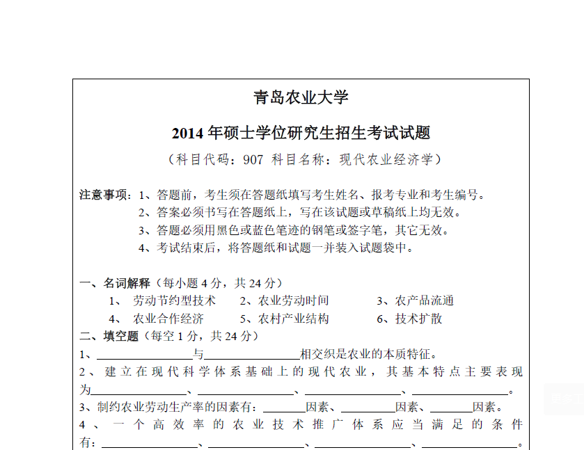 907-现代农业经济学(青岛农业大学2014年硕士学位研究生招生考试试题).pdf