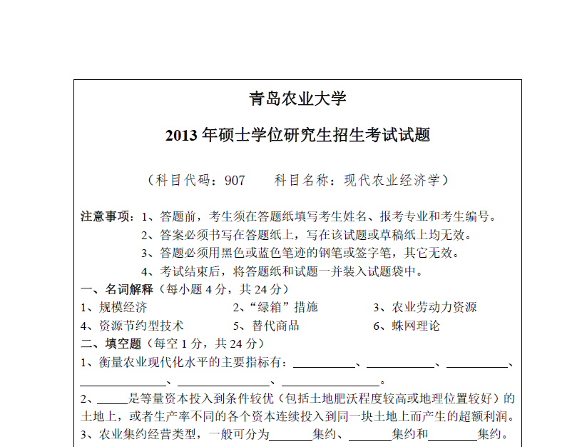 907-现代农业经济学(青岛农业大学2013年硕士学位研究生招生考试试题).pdf