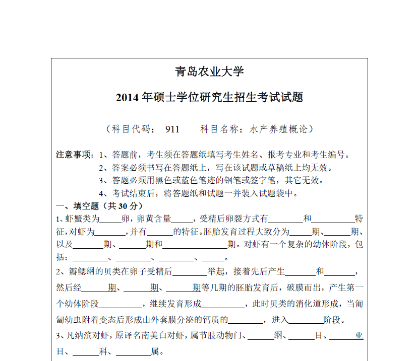 911-水产养殖概论(青岛农业大学2014年硕士学位研究生招生考试试题).pdf