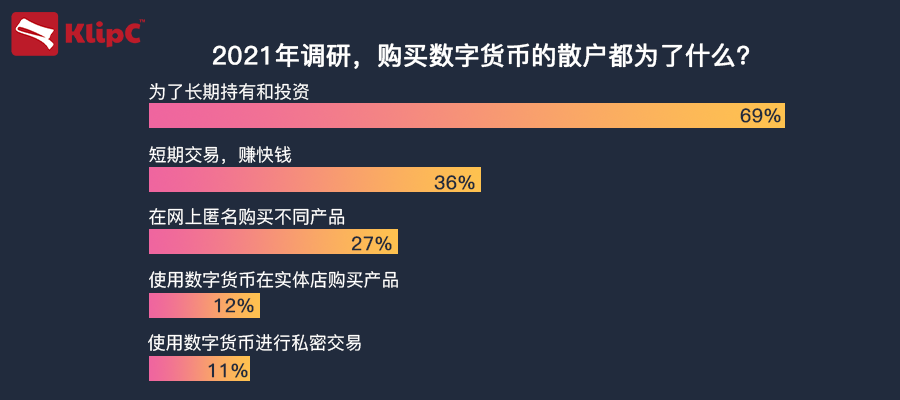 KlipC 对其用户的调查表明,数字货币并非昙花一现,他们对该资产类别的交易兴趣将继续增长。在上周对 900 家机构的调查中,KlipC 发现其中 10% 从事加密交易,20% 开始进行加密投资,50% 对加密交易感兴趣。