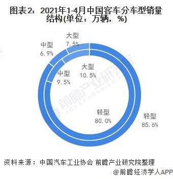 2021年1-4月全国客车累计销量为15.9万辆,恢复性增长52.2%。其中,轻型客车销量为13.76万辆,占比85.6%,与2020年同期相比,轻型客车销量占比提升5.6个百分点,反映出轻型客车是市场需求的主流车型,是拉动客车整体市场增长的主要动力。