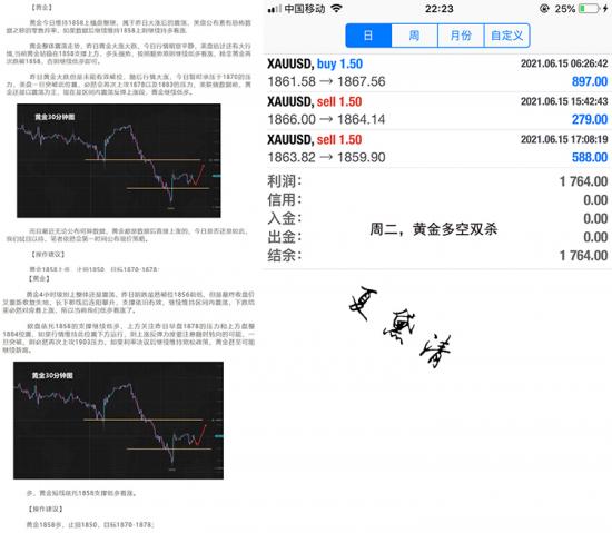 周二共盈利1764美元。投资如狩猎,要想成功狩猎,必须知己知彼;如果不想自己成为待宰的羔羊,就像草原上顶尖的猎手一样,必须要学会坚持和忍耐,并且该出手时就要果断出击获取属于自己的猎物。