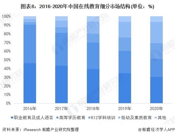 从中国的在线教育细分市场来看,2016-2020年,低幼及素质教育、K12学科培训在在线教育领域的市场份额持续扩大,2020年市场份额分别为24.5%和17.9%。职业教育及成人语言市场依靠庞大的社会刚需,一直占据着整个在线教育市场的主要份额。