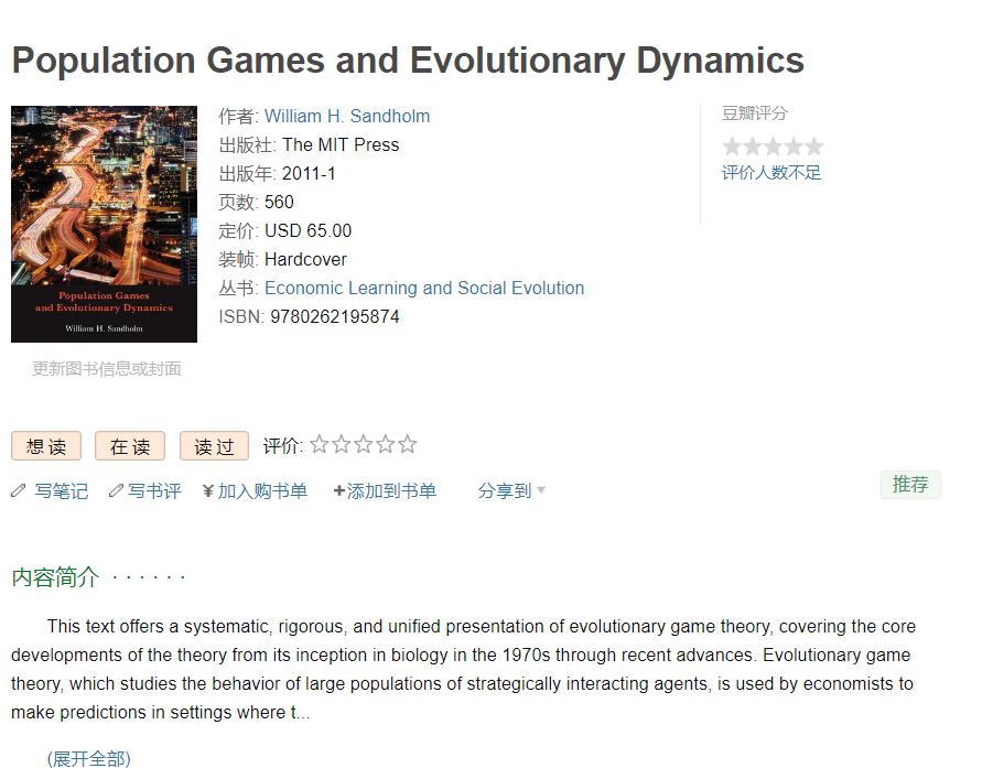 我之前也想了解演化博弈的入门材料,最好是一些经典的系统性教材,我在网站上查了一些,可以作为参考:
