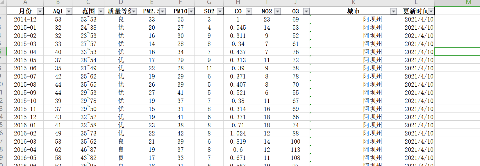 1.空气质量月度数据,包括 日期、AQI、范围、质量等级、PM2.5、PM10、SO2、CO、NO2、O3、城市