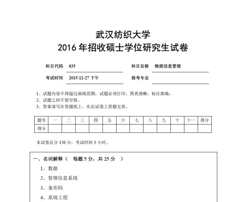 835物流信息管理(武汉纺织大学2016年招收硕士学位研究生试卷).rar
