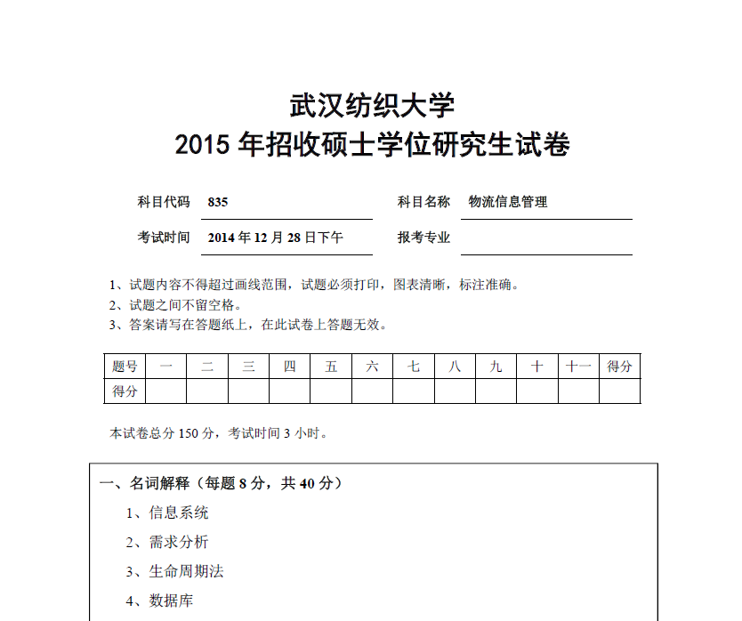 835物流信息管理(武汉纺织大学2015年招收硕士学位研究生试卷).rar