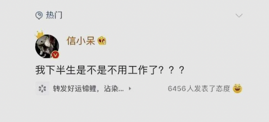 成为“中国锦鲤“之后,信小呆享受了热搜的最高“礼遇”,最多的时候一天有两三个相关话题,也享受了一波流量带来的红利。原本从事IT工作的信小呆也从国企辞职,开始了旅行兑奖。