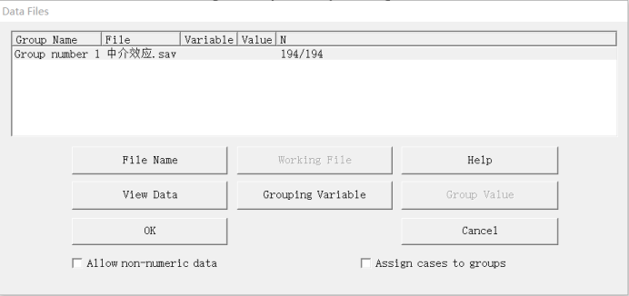 打开Amos数据选项菜单中选择数据集,点击按钮OK即可将数据导入Amos软件,作为本次中介效应模型的数据库。Amos使用的数据可以是Spss的sav.格式数据,也可以是Excel格式的数据,小伙伴可根据需要自由选择,本文构建中介效应模型使用的是Spss的sav.格式数据